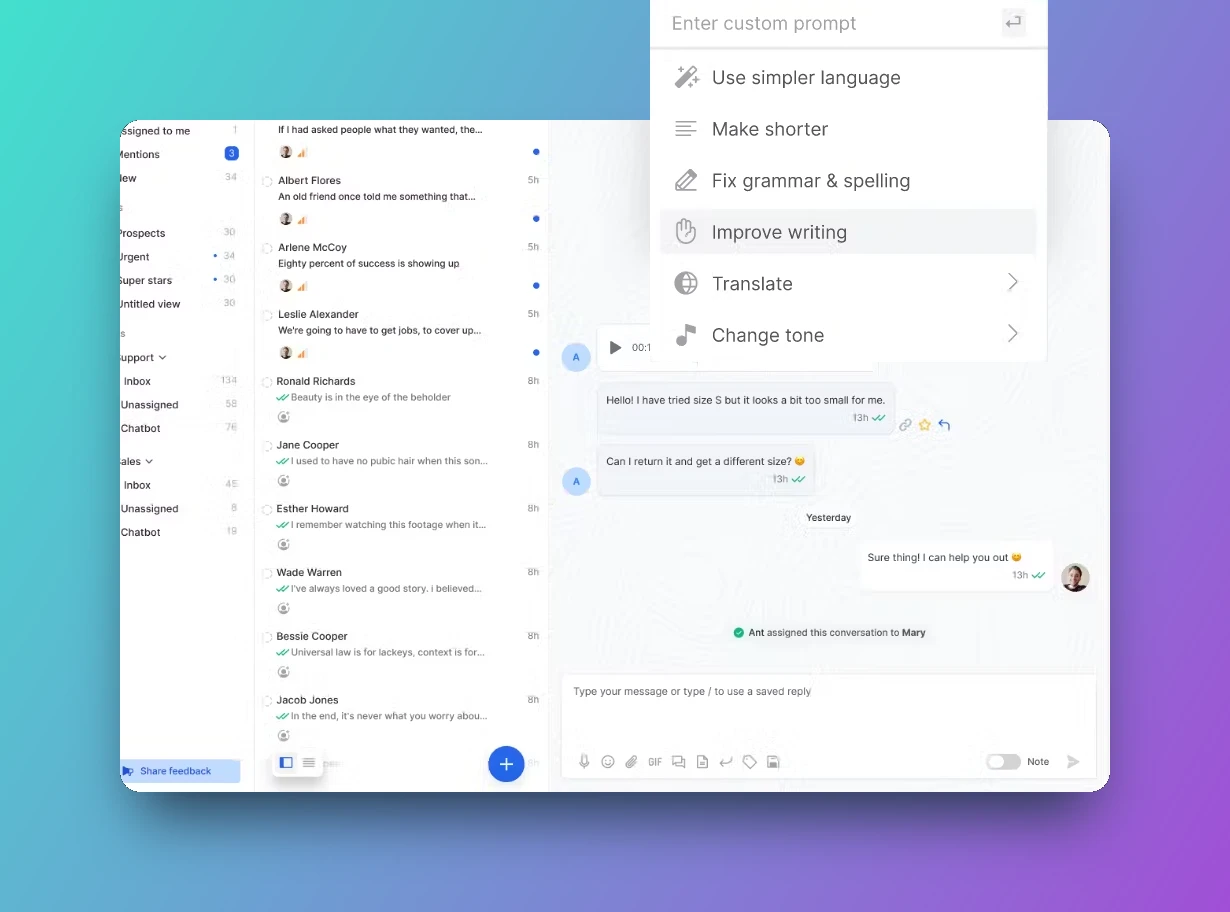 In-chat private notes, saved replies, tags, permissions, teams, assignments, and more.